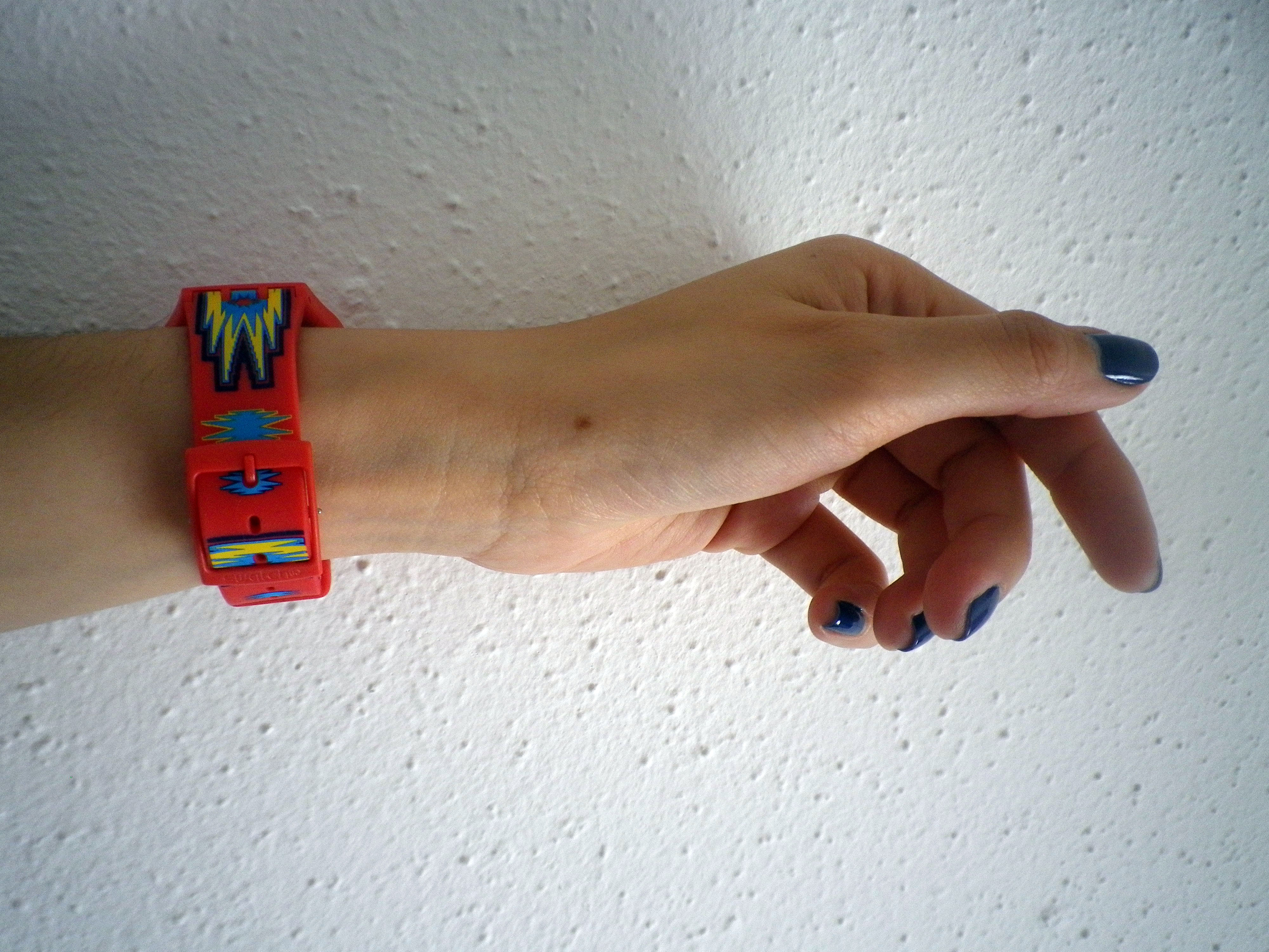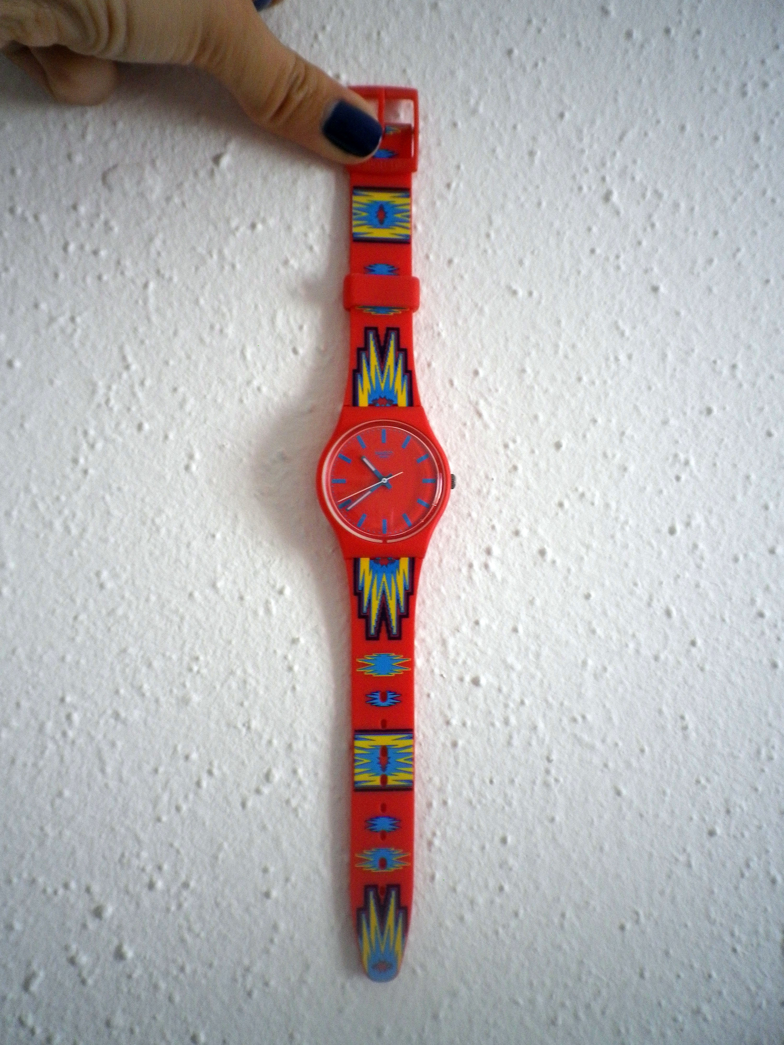 Pour commencer une montre swatch. J’étais plutôt partie pour un modèle blanc/transparent et doré et puis celle-ci corail multi color à l’imprimé navajo m’a tapé dans l’oeil. J’ai pourtant réussi à quitter la boutique sans avoir dégainé la carte puis finalement le coup de coeur a eu raison de moi 30 minutes plus tard…