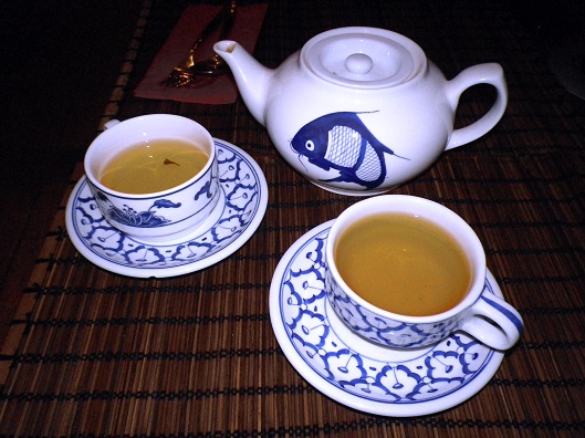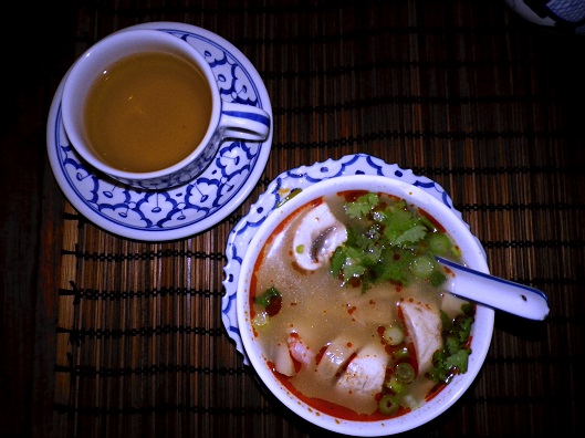 Un thé au jasmin, une soupe piquante aux crevettes et alors désolée, pour le plat principal, je me suis jetée sur mes Pad Thaï aux crevettes, pas eu le temps de les prendre en photo, mais elles étaient très bonnes !
