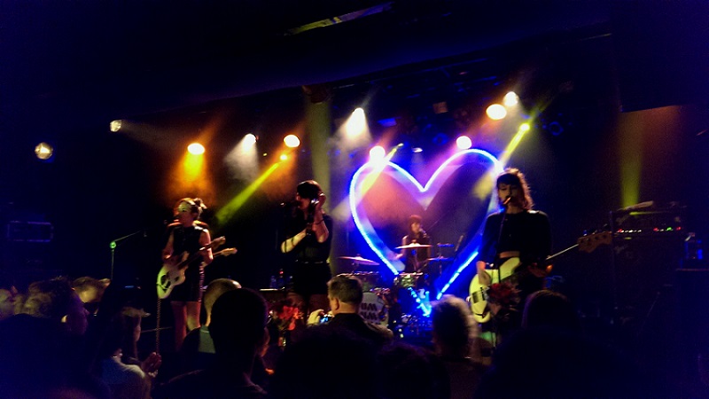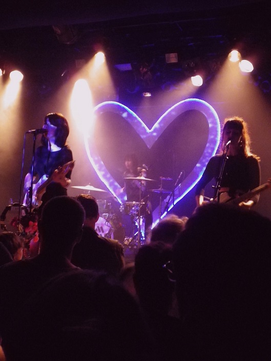 Puis est apparu le girl power sur scène, malgré un guitariste présent pour le live un peu effacé dans un coin,  quatre filles habillées tout de noir un peu sexy, dans une ambiance presque sixties. Un cœur géant en néon sur le mur du fond, des fleurs en plastiques accrochées aux micros et c’est parti pour 1h15 de New Wave 100% féminine.
