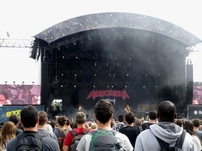 Revenons à la musique avec les excités d’Airbourne qui ont retourné le public en plein milieu de l’après midi, alliant énergie, folie et humour dans un show parfaitement orchestré. Les trois membres du groupe très très inspiré d’AC-DC rend hommage comme il se doit à ces derniers. Entre les deux musiciens guitariste bassiste qui se décrochent les cervicales et échangent de place en courant sur scène, le leader étale toute sa fougue en parcourant  de long en large tout l’espace qui lui était disponible. Il parvient même à se mêler au public sur les épaules d’un homme de la sécurité façon petit poney, n’arrêtant en rien son jeu de guitare. Après deux trois canettes de bières explosées en rythme sur sa tête et avoir dominé tout le parc de Saint Cloud du haut du mur d’amplis, l’australien aura laissé un nom dans les mémoires du festival. Pour ceux qui n’étaient pas encore totalement réveillés, le ton était donné.
